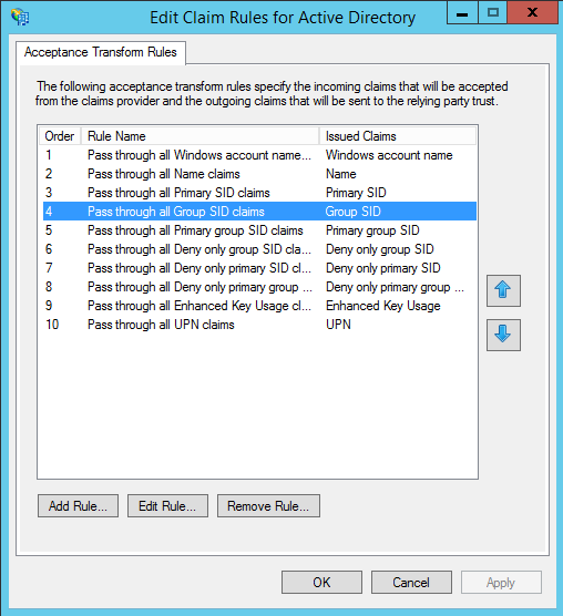 To illustrate, if I want to make an Authorisation rule based on Group SID values, it will work, since this is passed through from the default Claims Rules for the Active Directory Claims Provider, but if I want to make an Authorisation decision on E-mail Address, department or extensionAttribute13, it won’t work unless I add Send LDAP Attributes as Claims rules for these attributes to the Claims Provider rule set.