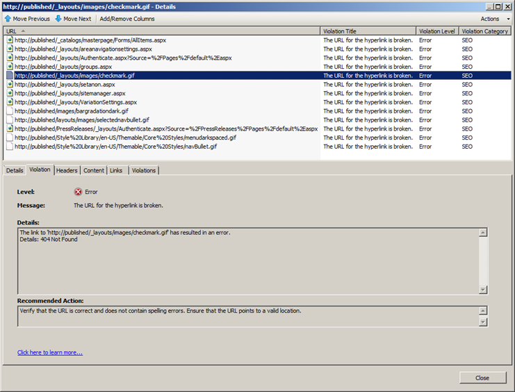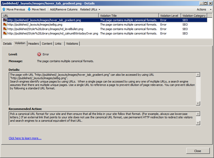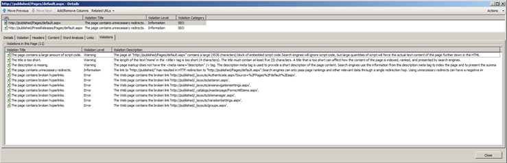 Unsurprisingly all of these errors point out fundamental problems in the site which content owners would want to correct even if they were unconcerned with page rank. The warnings, which I skipped over earlier, provide supplementary insight in to changes that can improve page rank in an otherwise functionally-correct website. Rather than discussing those individually, I’ll just include a screen shot of the Violations tab in the bottom half of the details pane. This tab summarises all of the violations on a selected page, which will improve the editor’s experience when making these changes.