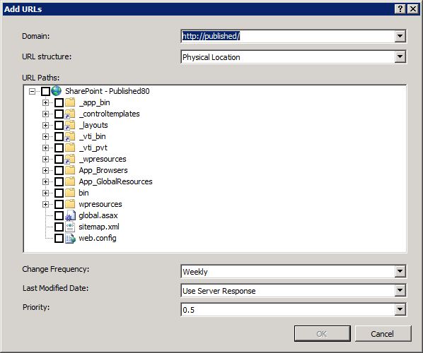At the bottom of the dialogue the Change Frequency tells search engines how often pages are likely to change. The priority details how important we consider our site to be relative to other URLs on our site (I must confess I don’t fully understand how this works, but I’m not responsible for content. 🙂). You can also tell Search Engines how to identify the Last Modified Date. More information on all of this can be found on TechNet.