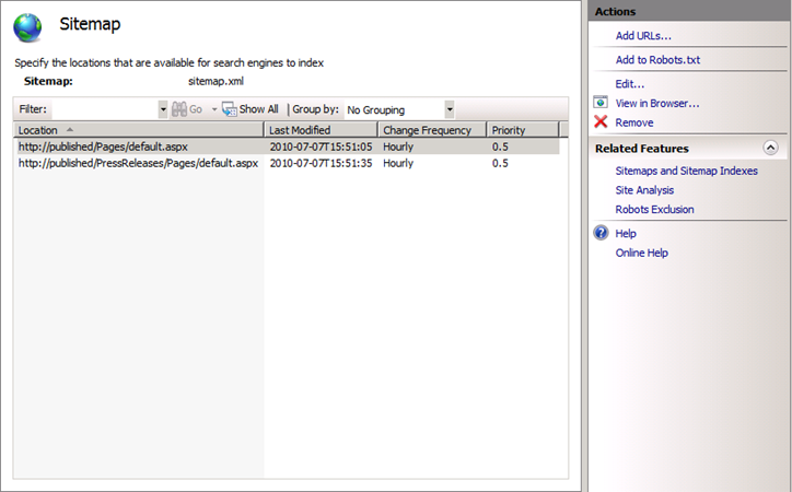 Also note, in the Related Features on the Actions pane, there’s a link to Robots Exclusion, which brings us to the final tool.