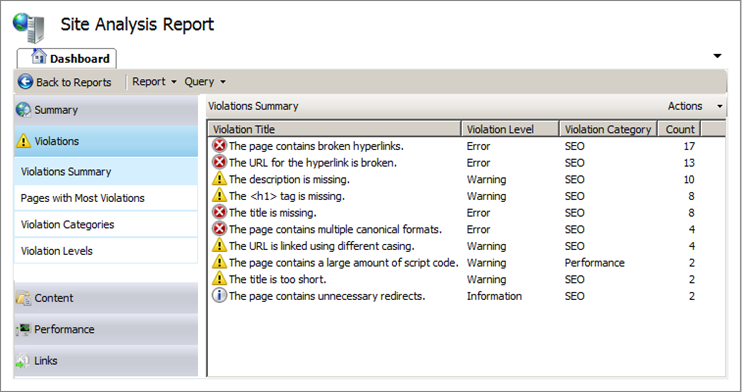 I shan’t go over everything here because there is an excellent three minute video on the SEO Toolkit home page (linked above), which details the basic functionality of the tool.