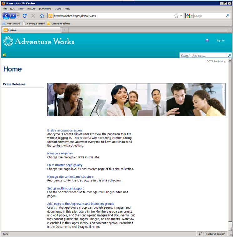 Drilling in to The title is missing, we find that the five pages are links to authenticated content on the out of the box Publishing site template’s home page, which are 401 unauthenticated errors in this case, since this is an anonymous access zone.